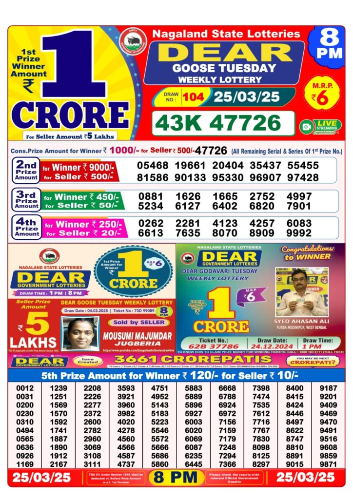Dear goose tuesday weekly lottery 8 pm result 25-3-25 Results Editorial Staff March 25, 2025 Leave a Comment on Dear goose tuesday weekly lottery 8 pm result 25-3-25 Posted in Dear Lottery 8 PM Result Share: XFacebookPinterestRedditVKDiggLinkedinMix Dear Magic Sunday Weekly Lottery Result Update 📅 Date: 25 March 2025 ⏰ Draw Time: 8:00 PM 🟢 Result Declared 🔗 View previous Dear Lottery 8 PM Result results Related Results Dear Clover Monday Weekly Lottery 8pm Result 02-03-26 Dear Magic Sunday Weekly Lottery 8pm Result 01-03-26 Dear Lucky Saturday Weekly Lottery 8pm Result 28-02-26 Dear Horizon Friday Weekly Lottery 8pm Result 27-02-26 Dear Fame Thursday Weekly Lottery 8pm Result 26-02-26 Dear Dream Wednesday Weekly Lottery 8pm Result 25-02-26 Dear Destiny Tuesday Weekly Lottery 8pm Result 24-02-26 Author: Results Editorial Staff