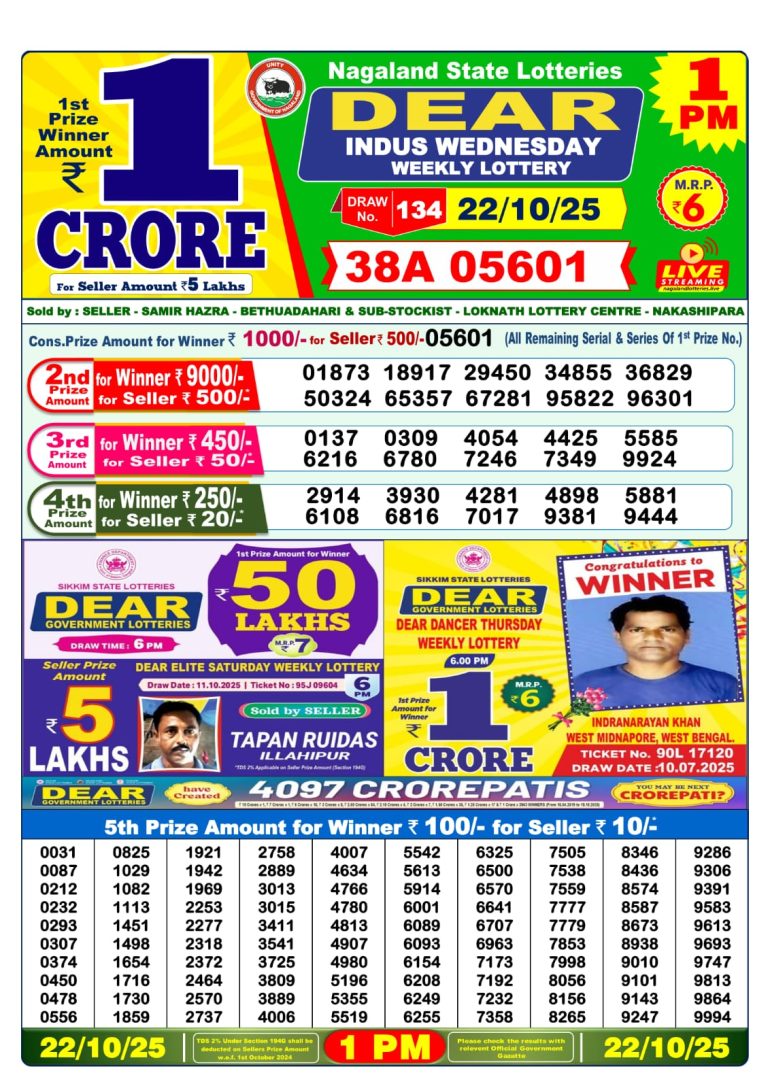 Dear Indus Wednesday Weekly Lottery 1 PM Result 22-10-25 0 Likes 2 Views Share now: XFacebookPinterestRedditVKDiggLinkedinMix Related Articles 0 4 Dear godavari tuesday weekly lottery 1 pm result 17-6-25 0 7 Dear narmada Saturday weekly lottery 1 pm result 26-07-25 0 6 Dear dwarka monday weekly lottery 1 pm result 17-2-25 0 2 Dear Indus Wednesday Weekly Lottery 1 PM Result 06-08-25