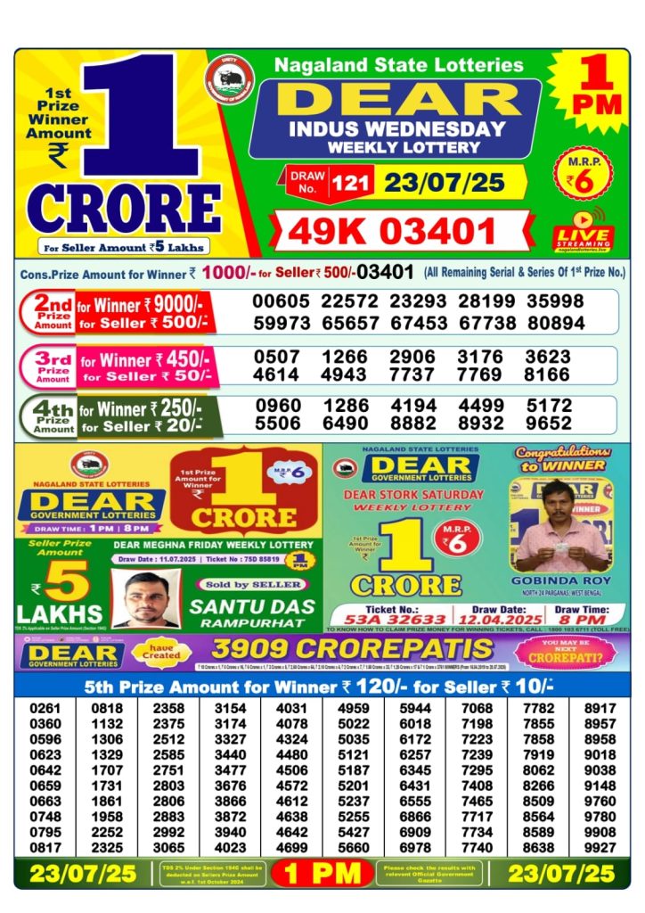 Dear indus wednesday weekly lottery 1 pm result 23-7-25