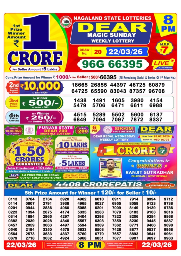 Dear Magic Sunday Weekly Lottery 8pm Result 22-03-26 Results Team March 22, 2026 Leave a Comment on Dear Magic Sunday Weekly Lottery 8pm Result 22-03-26 Posted in Dear Lottery 8 PM Result Share: XFacebookPinterestRedditVKDiggLinkedinMix Dear Fame Thursday Weekly Lottery Result Update 📅 Date: 22 March 2026 ⏰ Draw Time: 8:00 PM 🟢 Result Declared 🔗 View previous Dear Lottery 8 PM Result results Related Results Dear Fame Thursday Weekly Lottery 8pm Result 09-04-26 Dear Dream Wednesday Weekly Lottery 8pm Result 08-04-26 Dear Destiny Tuesday Weekly Lottery 8pm Result 07-04-26 Dear Clover Monday Weekly Lottery 8pm Result 06-04-26 Dear Magic Sunday Weekly Lottery 8pm Result 05-04-26 Dear Lucky Saturday Weekly Lottery 8pm Result 04-04-26 Dear Horizon Friday Weekly Lottery 8pm Result 03-04-26 Author: Results Team