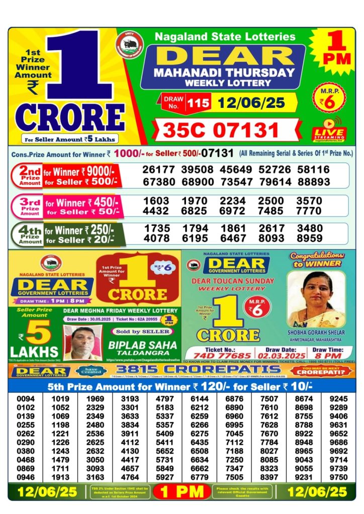 Dear mahanadi thursday weekly lottery 1 pm result 12-6-25 Results Editorial Staff June 12, 2025 Leave a Comment on Dear mahanadi thursday weekly lottery 1 pm result 12-6-25 Posted in Dear Lottery 1 PM Result Share: XFacebookPinterestRedditVKDiggLinkedinMix Dear Rise Monday Weekly Lottery Result Update 📅 Date: 12 June 2025 ⏰ Draw Time: 1:00 PM 🟢 Result Declared 🔗 View previous Dear Lottery 1 PM Result results Related Results Dear Rise Monday Weekly Lottery 1pm Result 02-03-26 Dear Wish Sunday Weekly Lottery 1pm Result 01-03-26 Dear Vision Saturday Weekly Lottery 1pm Result 28-02-26 Dear Victory Friday Weekly Lottery 1pm Result 27-02-26 Dear Star Thursday Weekly Lottery 1pm Result 26-02-26 Dear Spark Wednesday Weekly Lottery 1pm Result 25-02-26 Dear Shine Tuesday Weekly Lottery 1pm Result 24-02-26 Author: Results Editorial Staff