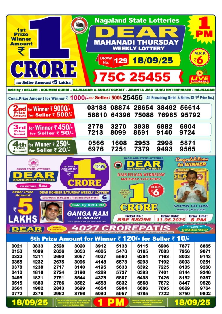 Dear Mahanadi Thursday Weekly Lottery 1 PM Result 18-09-25