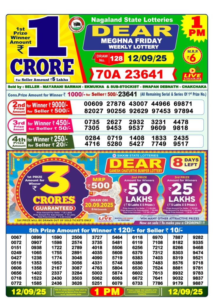 Dear Meghna Friday Weekly Lottery 1 PM Result 12-09-25
