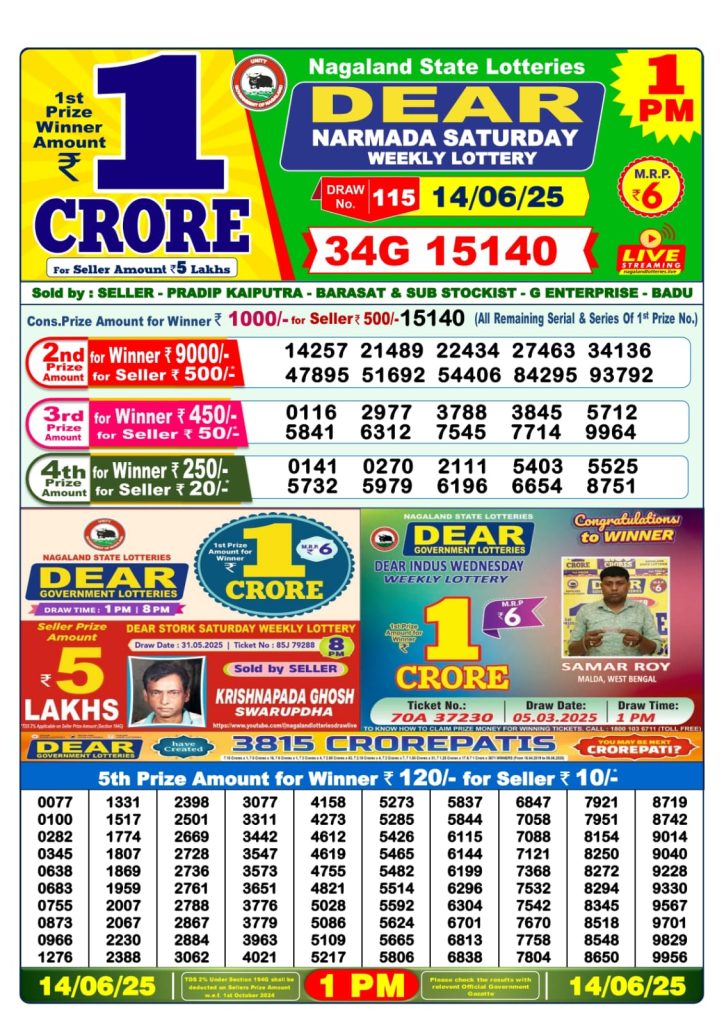 Dear narmada Saturday weekly lottery 1 pm result 14-6-25 Results Editorial Staff June 13, 2025 Leave a Comment on Dear narmada Saturday weekly lottery 1 pm result 14-6-25 Posted in Dear Lottery 1 PM Result Share: XFacebookPinterestRedditVKDiggLinkedinMix Dear Rise Monday Weekly Lottery Result Update 📅 Date: 13 June 2025 ⏰ Draw Time: 1:00 PM 🟢 Result Declared 🔗 View previous Dear Lottery 1 PM Result results Related Results Dear Rise Monday Weekly Lottery 1pm Result 02-03-26 Dear Wish Sunday Weekly Lottery 1pm Result 01-03-26 Dear Vision Saturday Weekly Lottery 1pm Result 28-02-26 Dear Victory Friday Weekly Lottery 1pm Result 27-02-26 Dear Star Thursday Weekly Lottery 1pm Result 26-02-26 Dear Spark Wednesday Weekly Lottery 1pm Result 25-02-26 Dear Shine Tuesday Weekly Lottery 1pm Result 24-02-26 Author: Results Editorial Staff
