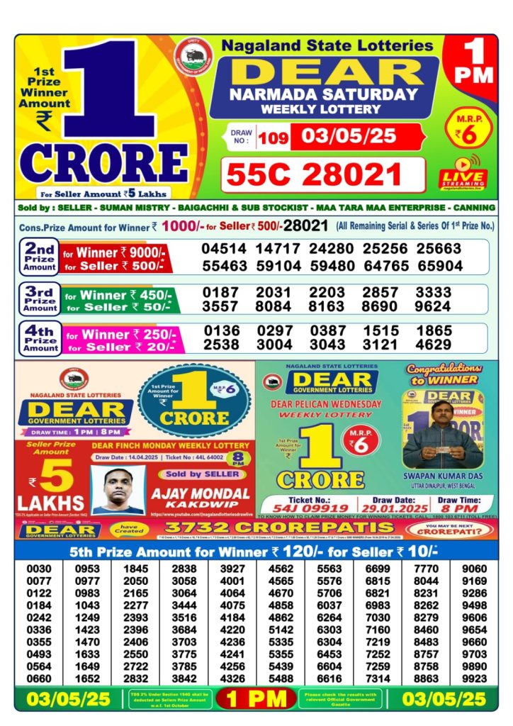Dear narmada Saturday weekly lottery 1 pm result 3-5-25