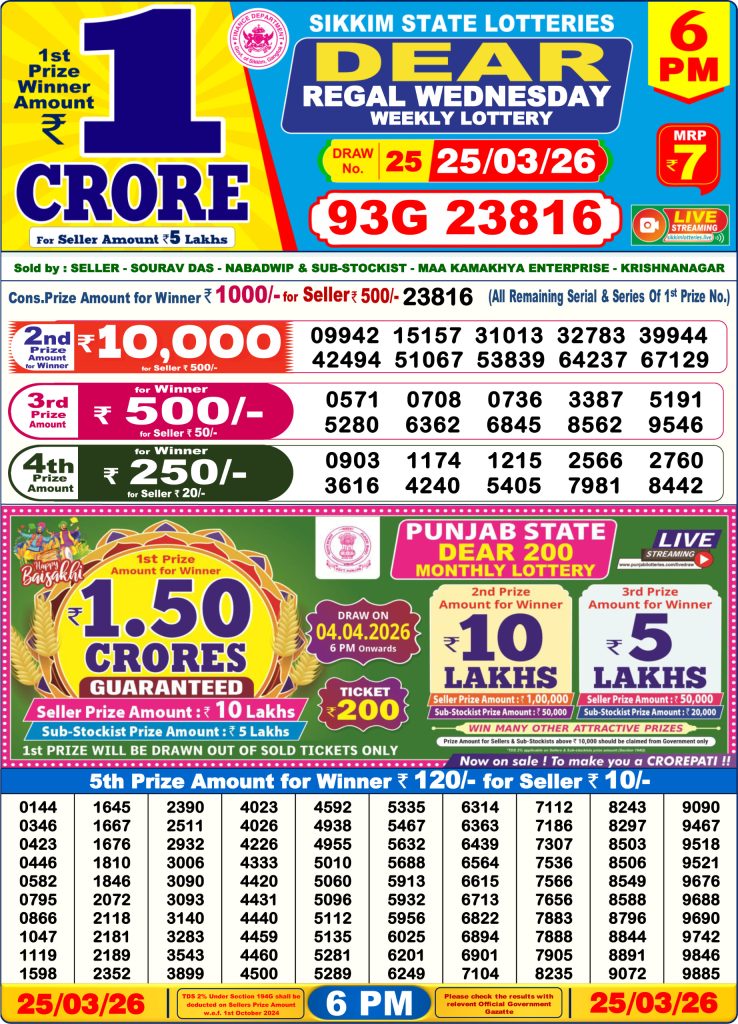 Dear Regal Wednesday Weekly Lottery 6pm Result 25-03-26