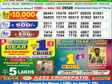 Dear Rise Monday Weekly Lottery 1pm Result 17-11-25 0 Likes 4 Views Share now: XFacebookPinterestRedditVKDiggLinkedinMix Related Articles 0 7 Dear narmada Saturday weekly lottery 1 pm result 1-3-25 0 4 Dear Shine Tuesday Weekly Lottery 1pm Result 23-12-25 0 8 Dear dwarka monday weekly lottery 1 pm result 12-5-25 0 5 Dear Indus Wednesday Weekly Lottery 1 PM Result 03-09-25