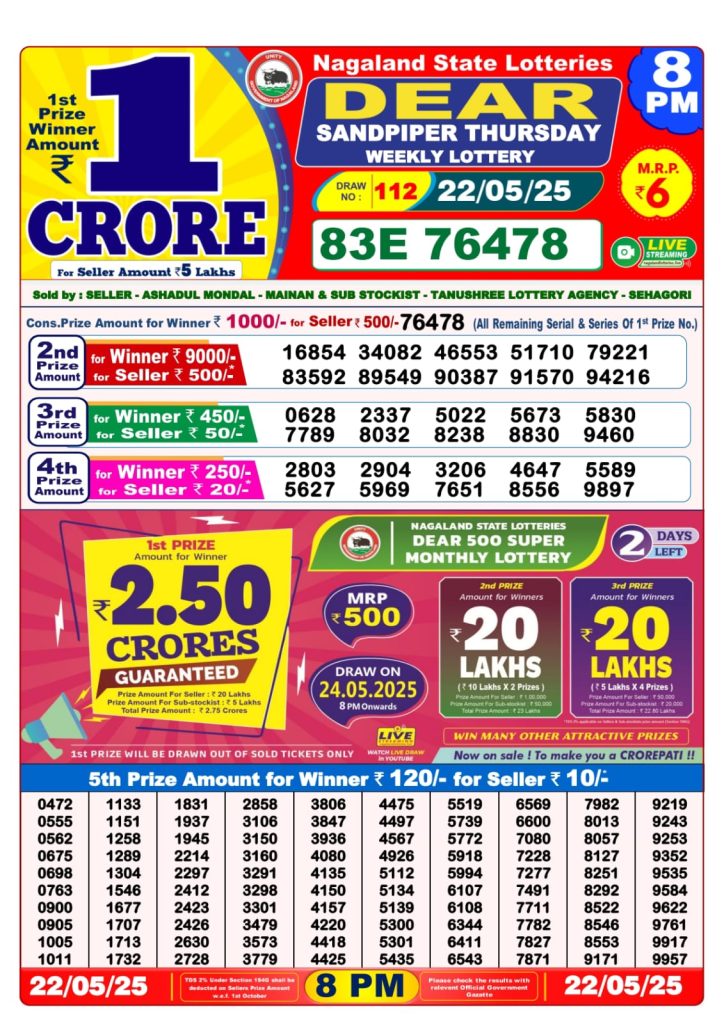 Dear sandpiper Thursday weekly lottery 8 pm result 22-5-25 Results Editorial Staff May 22, 2025 Leave a Comment on Dear sandpiper Thursday weekly lottery 8 pm result 22-5-25 Posted in Dear Lottery 8 PM Result Share: XFacebookPinterestRedditVKDiggLinkedinMix Dear Clover Monday Weekly Lottery Result Update 📅 Date: 22 May 2025 ⏰ Draw Time: 8:00 PM 🟢 Result Declared 🔗 View previous Dear Lottery 8 PM Result results Related Results Dear Clover Monday Weekly Lottery 8pm Result 02-03-26 Dear Magic Sunday Weekly Lottery 8pm Result 01-03-26 Dear Lucky Saturday Weekly Lottery 8pm Result 28-02-26 Dear Horizon Friday Weekly Lottery 8pm Result 27-02-26 Dear Fame Thursday Weekly Lottery 8pm Result 26-02-26 Dear Dream Wednesday Weekly Lottery 8pm Result 25-02-26 Dear Destiny Tuesday Weekly Lottery 8pm Result 24-02-26 Author: Results Editorial Staff