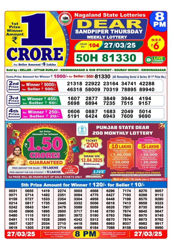 Dear sandpiper Thursday weekly lottery 8 pm result 27-3-25 Results Editorial Staff March 27, 2025 Leave a Comment on Dear sandpiper Thursday weekly lottery 8 pm result 27-3-25 Posted in Dear Lottery 8 PM Result Share: XFacebookPinterestRedditVKDiggLinkedinMix Dear Magic Sunday Weekly Lottery Result Update 📅 Date: 27 March 2025 ⏰ Draw Time: 8:00 PM 🟢 Result Declared 🔗 View previous Dear Lottery 8 PM Result results Related Results Dear Clover Monday Weekly Lottery 8pm Result 02-03-26 Dear Magic Sunday Weekly Lottery 8pm Result 01-03-26 Dear Lucky Saturday Weekly Lottery 8pm Result 28-02-26 Dear Horizon Friday Weekly Lottery 8pm Result 27-02-26 Dear Fame Thursday Weekly Lottery 8pm Result 26-02-26 Dear Dream Wednesday Weekly Lottery 8pm Result 25-02-26 Dear Destiny Tuesday Weekly Lottery 8pm Result 24-02-26 Author: Results Editorial Staff