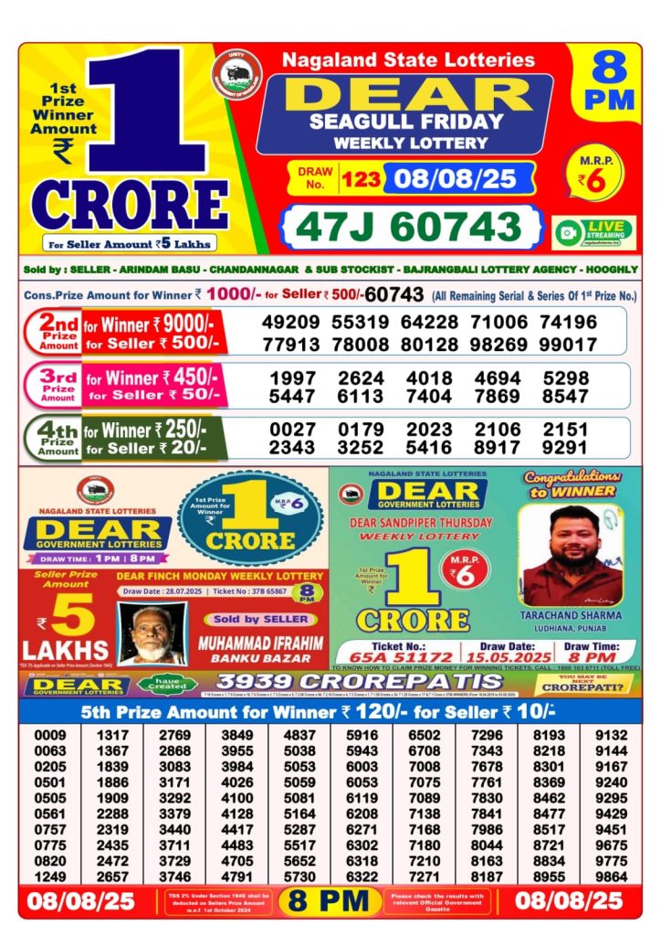 Dear Seagull Friday Weekly Lottery 8 PM Result 08-08-25 wpailnadmin August 8, 2025 Leave a Comment on Dear Seagull Friday Weekly Lottery 8 PM Result 08-08-25 Posted in Dear Lottery 8 PM Result Share: XFacebookPinterestRedditVKDiggLinkedinMix Dear Clover Monday Weekly Lottery Result Update 📅 Date: 08 August 2025 ⏰ Draw Time: 8:00 PM 🟢 Result Declared 🔗 View previous Dear Lottery 8 PM Result results Related Results Dear Clover Monday Weekly Lottery 8pm Result 02-03-26 Dear Magic Sunday Weekly Lottery 8pm Result 01-03-26 Dear Lucky Saturday Weekly Lottery 8pm Result 28-02-26 Dear Horizon Friday Weekly Lottery 8pm Result 27-02-26 Dear Fame Thursday Weekly Lottery 8pm Result 26-02-26 Dear Dream Wednesday Weekly Lottery 8pm Result 25-02-26 Dear Destiny Tuesday Weekly Lottery 8pm Result 24-02-26 Author: wpailnadmin Website
