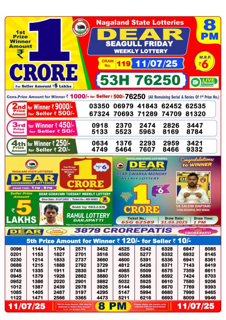 Dear seagull friday weekly lottery 8 pm result 11-7-25