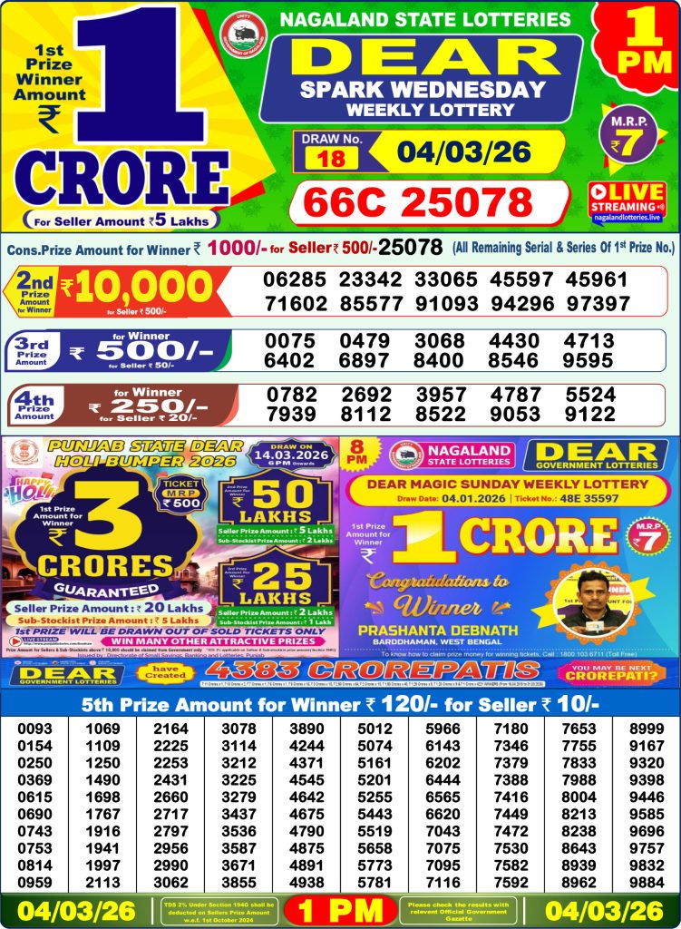 Dear Spark Wednesday Weekly Lottery 1pm Result 04-03-26 Results Team March 4, 2026 Leave a Comment on Dear Spark Wednesday Weekly Lottery 1pm Result 04-03-26 Posted in Dear Lottery 1 PM Result Share: XFacebookPinterestRedditVKDiggLinkedinMix Dear Wish Sunday Weekly Lottery Result Update 📅 Date: 04 March 2026 ⏰ Draw Time: 1:00 PM 🟢 Result Declared 🔗 View previous Dear Lottery 1 PM Result results Related Results Dear Wish Sunday Weekly Lottery 1pm Result 12-04-26 Dear Vision Saturday Weekly Lottery 1pm Result 11-04-26 Dear Victory Friday Weekly Lottery 1pm Result 10-04-26 Dear Star Thursday Weekly Lottery 1pm Result 09-04-26 Dear Spark Wednesday Weekly Lottery 1pm Result 08-04-26 Dear Shine Tuesday Weekly Lottery 1pm Result 07-04-26 Dear Rise Monday Weekly Lottery 1pm Result 06-04-26 Author: Results Team