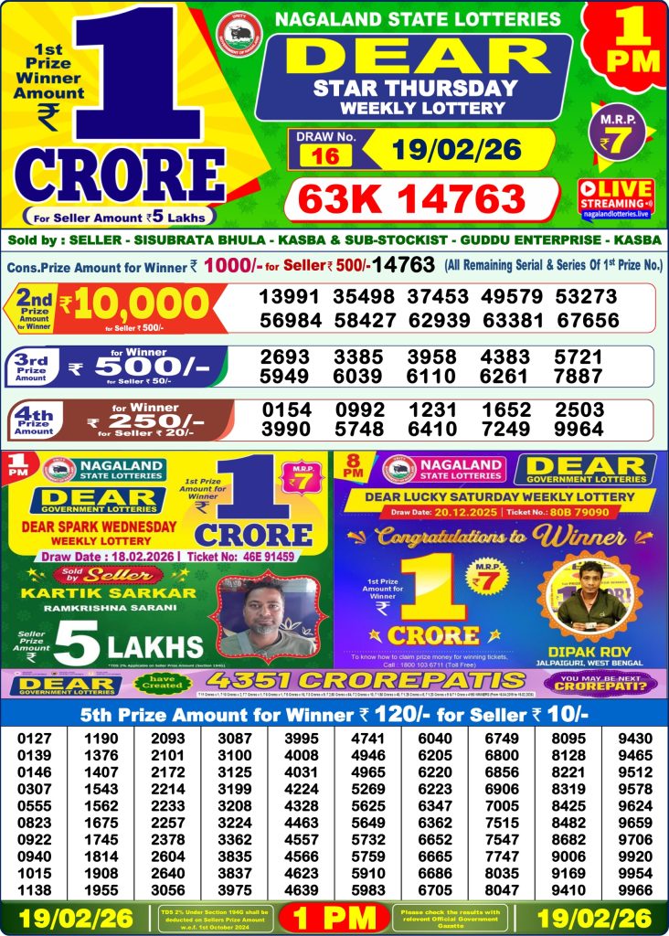 Dear Star Thursday Weekly Lottery 1pm Result 19-02-26 Results Team February 19, 2026 Leave a Comment on Dear Star Thursday Weekly Lottery 1pm Result 19-02-26 Posted in Dear Lottery 1 PM Result Share: XFacebookPinterestRedditVKDiggLinkedinMix Dear Wish Sunday Weekly Lottery Result Update 📅 Date: 19 February 2026 ⏰ Draw Time: 1:00 PM 🟢 Result Declared 🔗 View previous Dear Lottery 1 PM Result results Related Results Dear Rise Monday Weekly Lottery 1pm Result 02-03-26 Dear Wish Sunday Weekly Lottery 1pm Result 01-03-26 Dear Vision Saturday Weekly Lottery 1pm Result 28-02-26 Dear Victory Friday Weekly Lottery 1pm Result 27-02-26 Dear Star Thursday Weekly Lottery 1pm Result 26-02-26 Dear Spark Wednesday Weekly Lottery 1pm Result 25-02-26 Dear Shine Tuesday Weekly Lottery 1pm Result 24-02-26 Author: Results Team