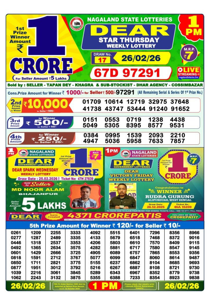 Dear Star Thursday Weekly Lottery 1pm Result 26-02-26