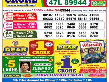 2025-10-04 Punjab State Dear 50 Jackal Saturday Weekly Lottery 6 PM Result 04-10-25  2025-10-04 Kerala Bumper BR-105 Lottery Result 04-10-25 Declared  2025-10-04 Dear Stork Saturday Weekly Lottery 8 PM Result 04-10-25  2025-10-04 Dear Elite Saturday Weekly Lottery 6 PM Result 04-10-25  2025-10-04 Labh Laxmi Joy Saturday Weekly Lottery 4 PM Result 04-10-25  2025-10-04 Dear Narmada Saturday Weekly Lottery 1 PM Result 04-10-25  2025-10-03 Dear Seagull Friday Weekly Lottery 8 PM Result 03-10-25  2025-10-03 Punjab State Dear 50 colt Friday Weekly Lottery 6 PM Result 03-10-25  2025-10-03 Dear Crown Friday Weekly Lottery 6 PM Result 03-10-25