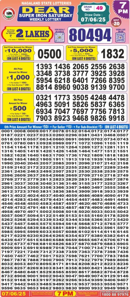 Dear super iron saturday weekly lottery 7 pm result 7-6-25