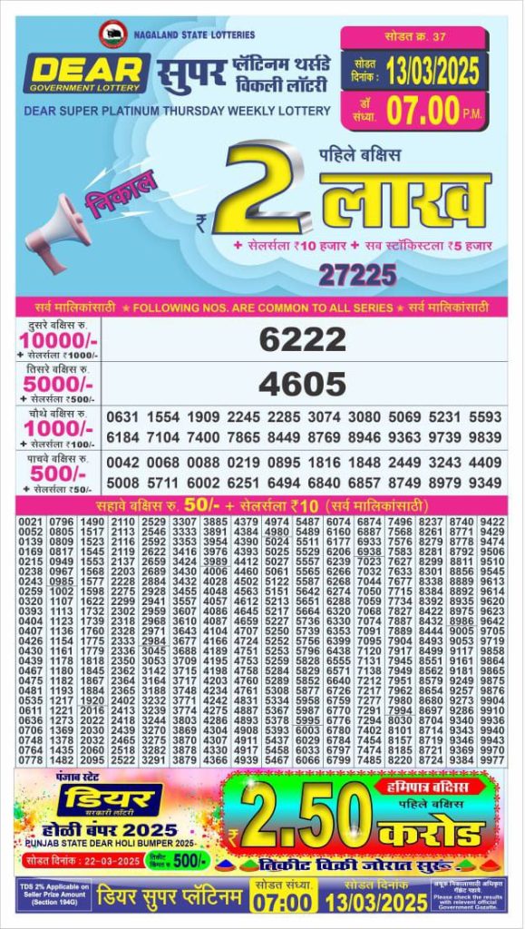 Dear super platinum Thursday weekly lottery 7 pm result 13-3-25