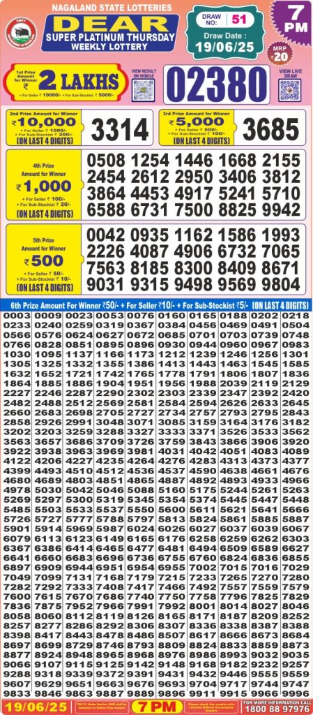 Dear super platinum Thursday weekly lottery 7 pm result 19-6-25