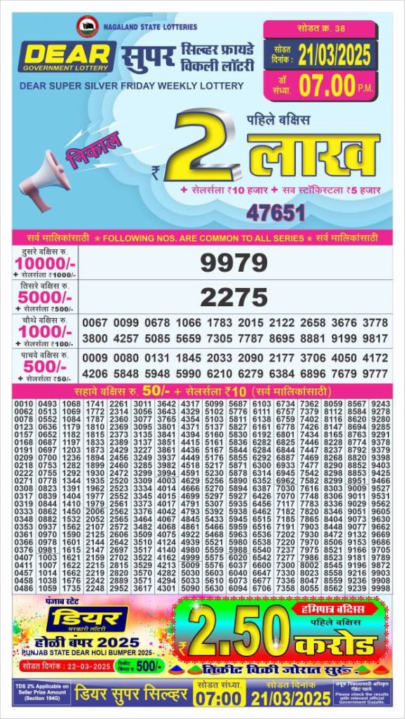 Dear super silver friday weekly lottery 7 pm result 21-3-25 Results Editorial Staff March 21, 2025 Leave a Comment on Dear super silver friday weekly lottery 7 pm result 21-3-25 Posted in Dear Super Lottery 7 PM Result Share: XFacebookPinterestRedditVKDiggLinkedinMix Related Results Dear Super Mercury Sunday Weekly Lottery 7 PM Result 27-07-25 Dear super iron saturday weekly lottery 7 pm result 26-7-25 Dear super silver friday weekly lottery 7 pm result 25-7-25 Dear super platinum Thursday weekly lottery 7 pm result 24-7-25 Dear super diamond Tuesday weekly lottery 7 pm result 22-7-25 Dear super gold monday weekly lottery 7 pm result 21-7-25 Dear super mercury Sunday weekly lottery 7 pm result 20-7-25 Author: Results Editorial Staff