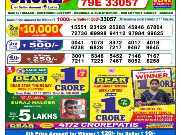 Dear Vision Saturday Weekly Lottery 1pm Result 03-01-26 0 Likes 2 Views Share now: XFacebookPinterestRedditVKDiggLinkedinMix Related Articles 0 3 Dear Wish Sunday Weekly Lottery 1pm Result 30-11-25 0 5 Dear indus wednesday weekly lottery 1 pm result 04-6-25 0 6 Dear dwarka monday weekly lottery 1 pm result 9-6-25 0 7 Dear mahanadi thursday weekly lottery 1 pm result 26-6-25