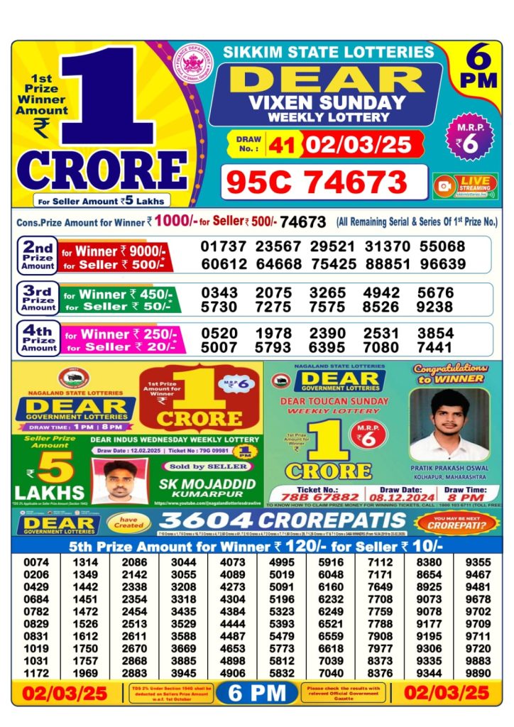 Dear vixen sunday weekly lottery 6 pm result 2/3/25