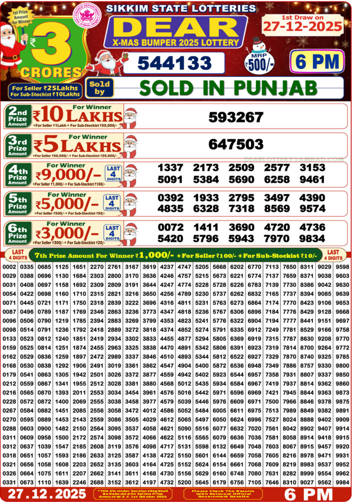 Dear X-Mas Bumper 6pm Lottery Result 27-12-25 Results Editorial Staff December 27, 2025 Leave a Comment on Dear X-Mas Bumper 6pm Lottery Result 27-12-25 Posted in Results Share: XFacebookPinterestRedditVKDiggLinkedinMix Related Results Punjab State Dear 200 Monthly Lottery 6pm Result 07-02-26 Punjab State Lohri Bumper Lottery Result 2026 Live Updates Punjab State Dear 100 Monthly Lottery 7pm Result 09-12-25 Punjab State Lottery Dear 100 Monthly 7pm Result 11-11-2025 Dear 2000 Monthly Lottery 7pm Result 08-11-25 Check Now Dear Puja Bumper Lottery Result 11-10-25 Publish Kerala Bumper BR-105 Lottery Result 04-10-25 Declared Author: Results Editorial Staff