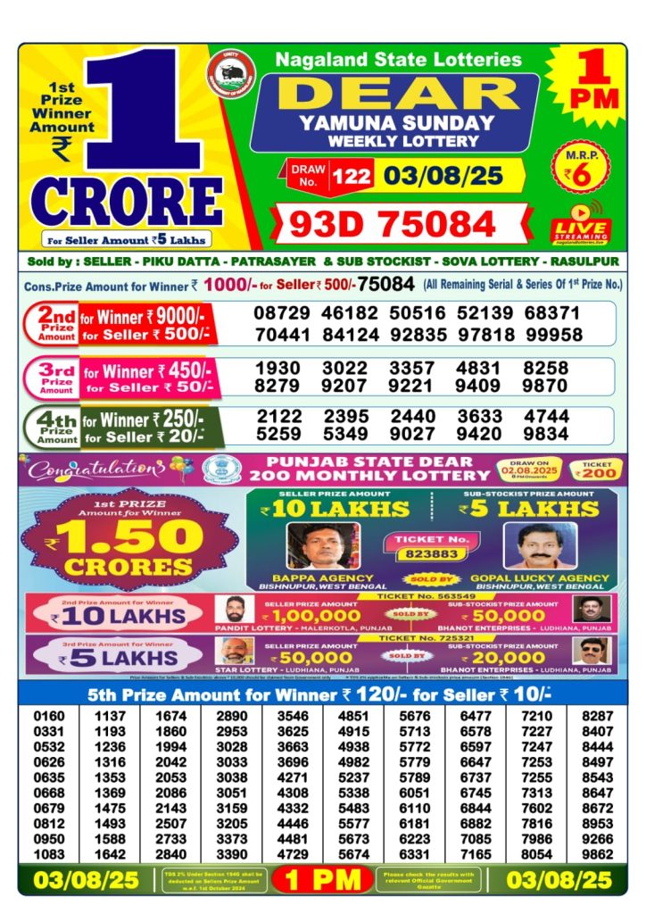 Dear Yamuna Sunday Weekly Lottery 1 PM Result 03-08-25 wpailnadmin August 3, 2025 Leave a Comment on Dear Yamuna Sunday Weekly Lottery 1 PM Result 03-08-25 Posted in Dear Lottery 1 PM Result Share: XFacebookPinterestRedditVKDiggLinkedinMix Dear Rise Monday Weekly Lottery Result Update 📅 Date: 03 August 2025 ⏰ Draw Time: 1:00 PM 🟢 Result Declared 🔗 View previous Dear Lottery 1 PM Result results Related Results Dear Rise Monday Weekly Lottery 1pm Result 02-03-26 Dear Wish Sunday Weekly Lottery 1pm Result 01-03-26 Dear Vision Saturday Weekly Lottery 1pm Result 28-02-26 Dear Victory Friday Weekly Lottery 1pm Result 27-02-26 Dear Star Thursday Weekly Lottery 1pm Result 26-02-26 Dear Spark Wednesday Weekly Lottery 1pm Result 25-02-26 Dear Shine Tuesday Weekly Lottery 1pm Result 24-02-26 Author: wpailnadmin Website