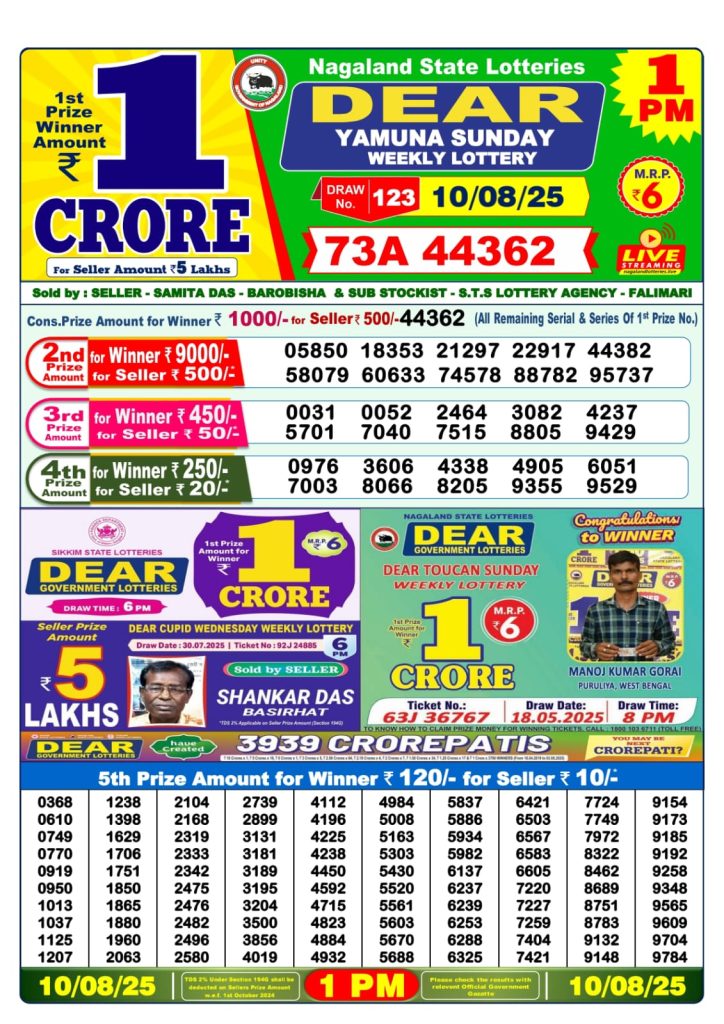 Dear Yamuna Sunday Weekly Lottery 1 PM Result 10-08-25 Results Editorial Staff August 10, 2025 Leave a Comment on Dear Yamuna Sunday Weekly Lottery 1 PM Result 10-08-25 Posted in Dear Lottery 1 PM Result Share: XFacebookPinterestRedditVKDiggLinkedinMix Dear Wish Sunday Weekly Lottery Result Update 📅 Date: 10 August 2025 ⏰ Draw Time: 1:00 PM 🟢 Result Declared 🔗 View previous Dear Lottery 1 PM Result results Related Results Dear Rise Monday Weekly Lottery 1pm Result 02-03-26 Dear Wish Sunday Weekly Lottery 1pm Result 01-03-26 Dear Vision Saturday Weekly Lottery 1pm Result 28-02-26 Dear Victory Friday Weekly Lottery 1pm Result 27-02-26 Dear Star Thursday Weekly Lottery 1pm Result 26-02-26 Dear Spark Wednesday Weekly Lottery 1pm Result 25-02-26 Dear Shine Tuesday Weekly Lottery 1pm Result 24-02-26 Author: Results Editorial Staff