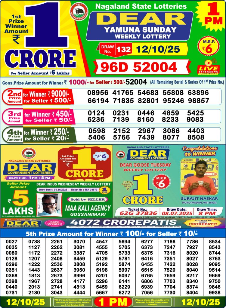 Dear Yamuna Sunday Weekly Lottery 1 PM Result 12-10-25