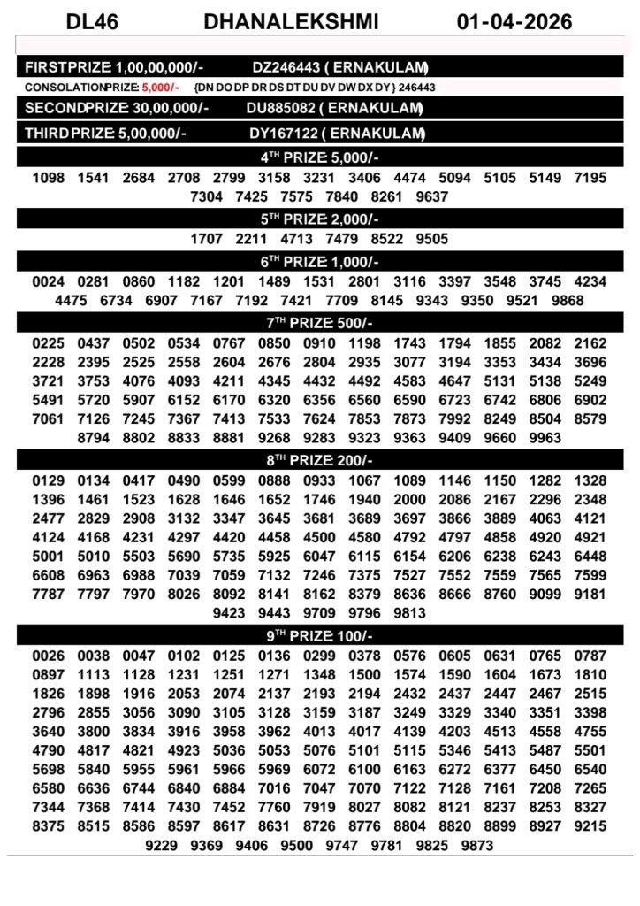 Kerala Lottery Result – DhanaLekshmi Draw | 01 April 2026