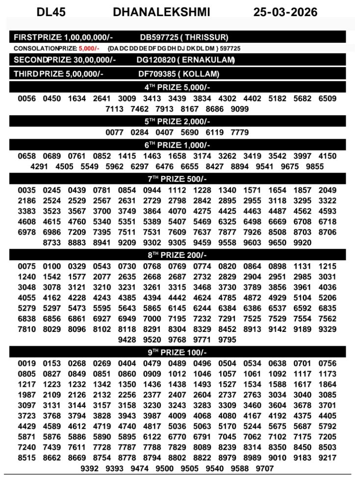 Kerala Lottery Result – DhanaLekshmi Draw | 25 March 2026