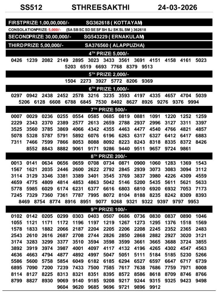 Kerala Lottery Result – Sthree Sakthi Draw | 24 March 2026