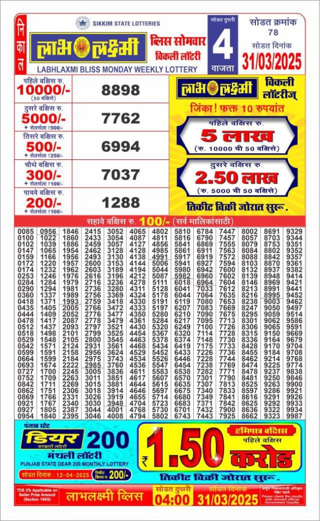 Labh Laxmi bliss monday weekly lottery 4 pm result 31/3/25