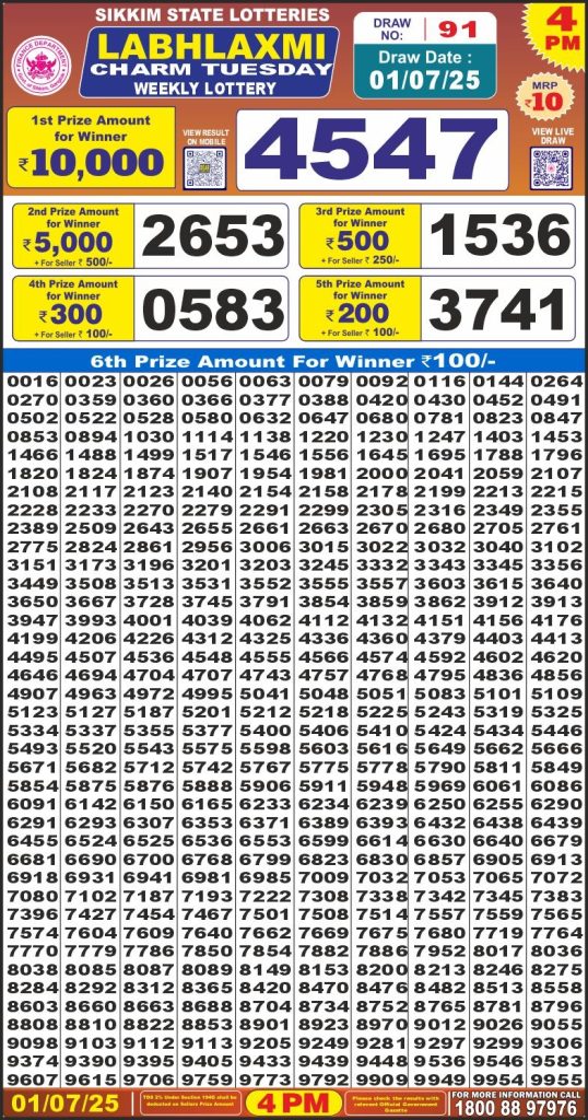 Labh Laxmi charm tuesday weekly lottery 4 pm result 1-7-25