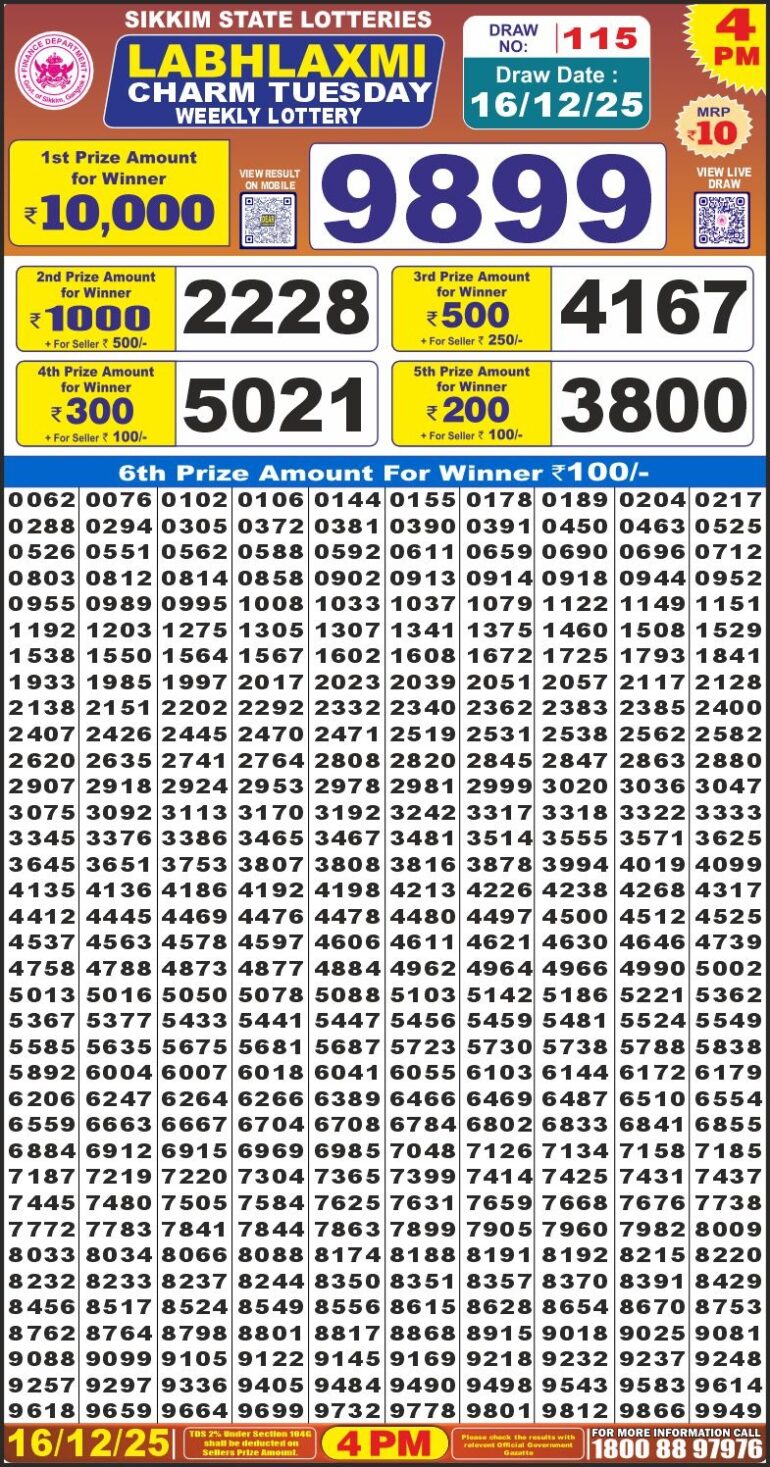 Labh Laxmi Charm Tuesday Weekly Lottery 4pm Result 16-12-25 0 Likes 4 Views Share now: XFacebookPinterestRedditVKDiggLinkedinMix Related Articles 0 3 Labhlaxmi Power Sunday Weekly Lottery 4 PM Result 31-08-25 0 4 Labhlaxmi Glad Thursday Weekly Lottery 4 PM Result 23-10-25 0 6 Labh Laxmi bliss monday weekly lottery 4 pm result 7-7-25 0 6 Labhlaxmi glad Thursday weekly lottery 4 pm result 10-7-25