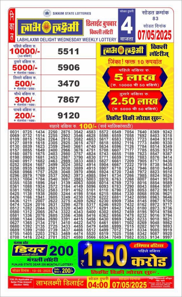 Labh Laxmi delight wednesday weekly lottery 4 pm result 7-5-25