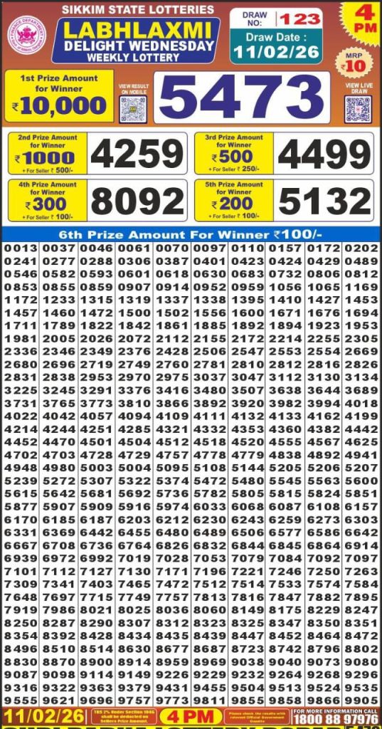 Labh Laxmi Delight Wednesday Weekly Lottery 4pm Result 11-02-26