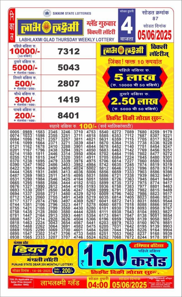 Labh laxmi glad Thursday weekly lottery 4 pm result 5-6-25 Results Editorial Staff June 5, 2025 Leave a Comment on Labh laxmi glad Thursday weekly lottery 4 pm result 5-6-25 Posted in Labh Laxmi Lottery 4PM Result Share: XFacebookPinterestRedditVKDiggLinkedinMix Labh Laxmi Bliss Monday 4PM Lottery Result Update 📅 Date: 05 June 2025 ⏰ Draw Time: 4:00 PM 🟢 Result Declared 🔗 View previous Labh Laxmi Lottery 4PM Result results Related Results Labh Laxmi Bliss Monday Weekly Lottery 4pm Result 02-03-26 Labh Laxmi Power Sunday Weekly Lottery 4pm Result 01-03-26 Labh Laxmi Joy Saturday Weekly Lottery 4pm Result 28-02-26 Labh Laxmi Glow Friday Weekly Lottery 4pm Result 27-02-26 Labh Laxmi Glad Thursday Weekly Lottery 4pm Result 26-02-26 Labh Laxmi Delight Wednesday Weekly Lottery 4pm Result 25-02-26 Labh Laxmi Charm Tuesday Weekly Lottery 4pm Result 24-02-26 Author: Results Editorial Staff