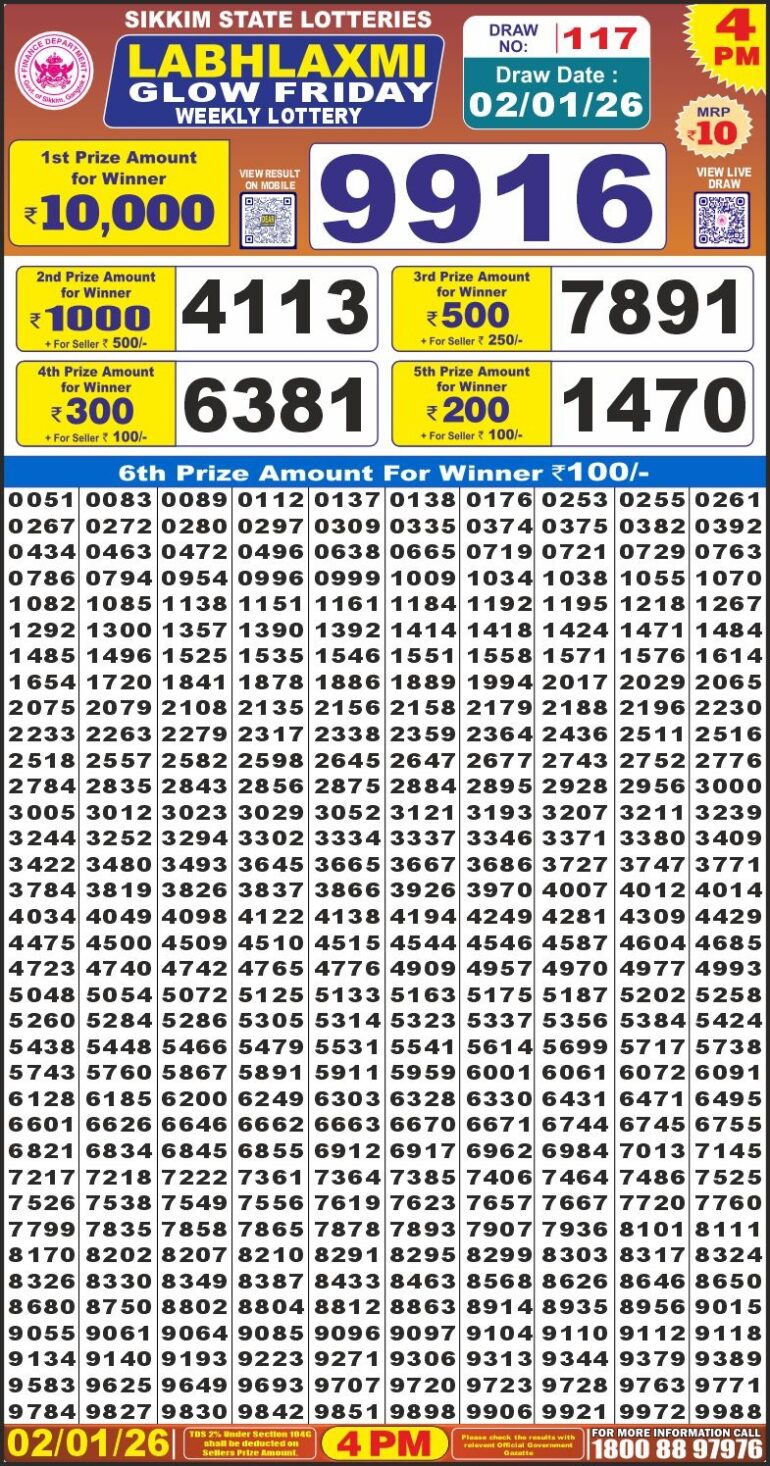 Labh Laxmi Glow Friday Weekly Lottery 4pm Result 02-01-26