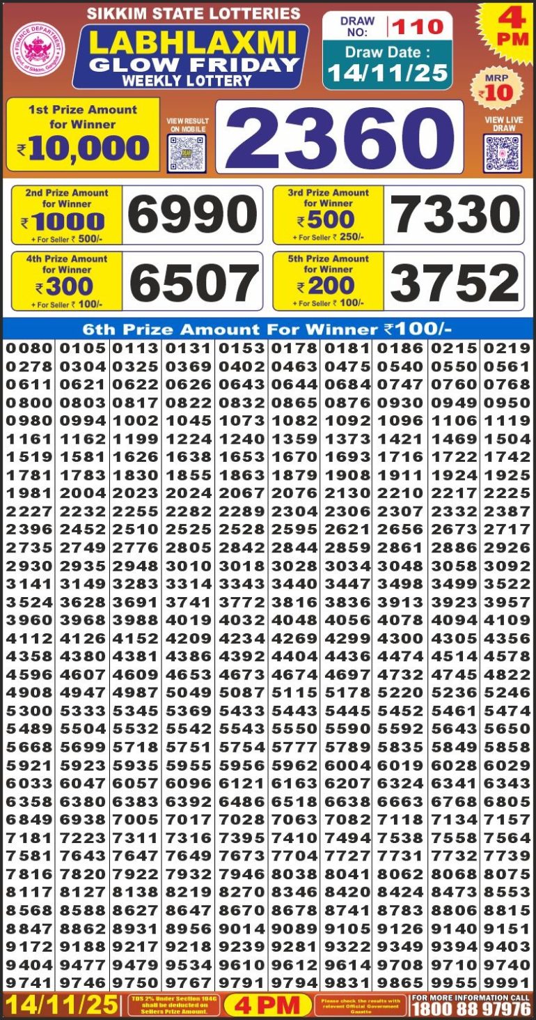 Labh Laxmi Glow Friday Weekly Lottery 4pm Result 14-11-25 0 Likes 2 Views Share now: XFacebookPinterestRedditVKDiggLinkedinMix Related Articles 0 4 Labh Laxmi Charm Tuesday Weekly Lottery 4 PM Result 07-10-25 0 5 Labh Laxmi joy saturday weekly lottery 4 pm result 17-5-25 0 9 Labhlaxmi power sunday weekly lottery 4 pm result 18-5-25 0 5 Labhlaxmi glow friday weekly lottery 4 pm result 16-5-25