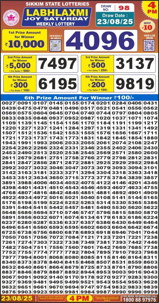 Labh Laxmi Joy Saturday Weekly Lottery 4 PM Result 23-08-25