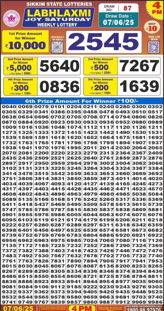 Labh Laxmi joy saturday weekly lottery 4 pm result 7-6-25