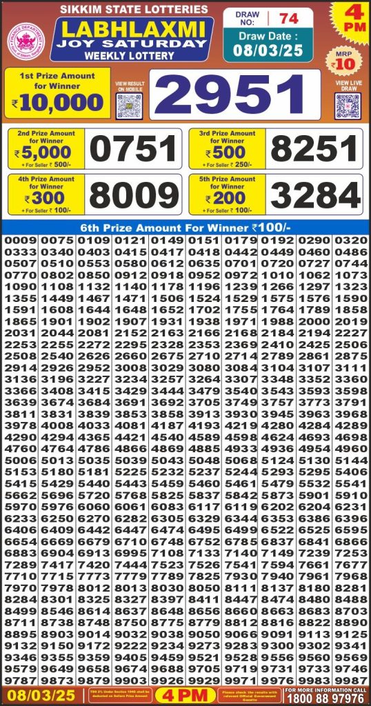 Labh Laxmi joy saturday weekly lottery 4 pm result 8-3-25