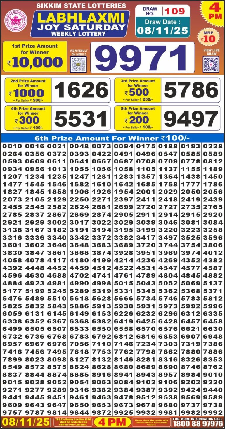 Labh Laxmi Joy Saturday Weekly Lottery 4pm Result 08-11-25