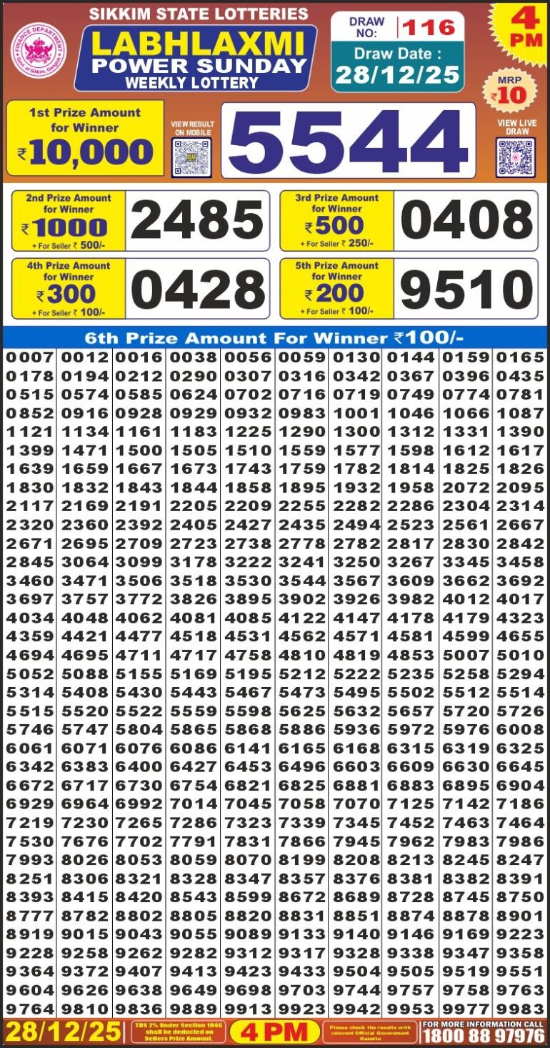 Labh Laxmi Power Sunday Weekly Lottery 4pm Result 28-12-25 0 Likes 3 Views Share now: XFacebookPinterestRedditVKDiggLinkedinMix Related Articles 0 8 Labh Laxmi charm tuesday weekly lottery 4 pm result 20-5-25 0 4 Labh Laxmi Glad Thursday Weekly Lottery 4pm Result 06-11-25 0 7 Labhlaxmi Glow Friday Weekly Lottery 4 PM Result 01-08-25 0 6 Labhlaxmi glow friday weekly lottery 4 pm result 21-2-25