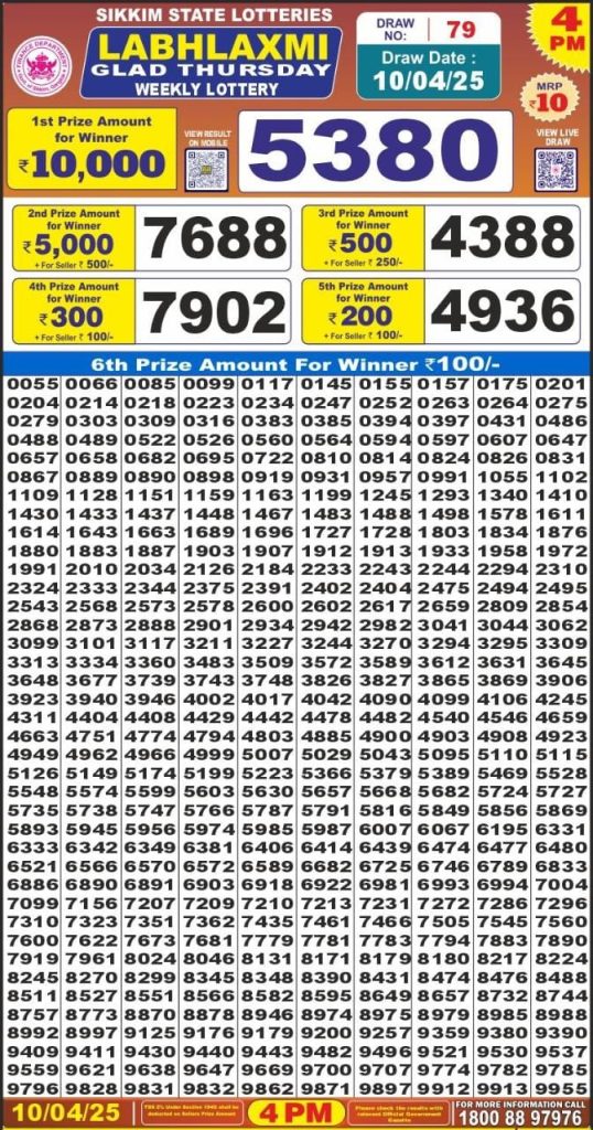 Labhlaxmi glad Thursday weekly lottery 4 pm result 10-4-25