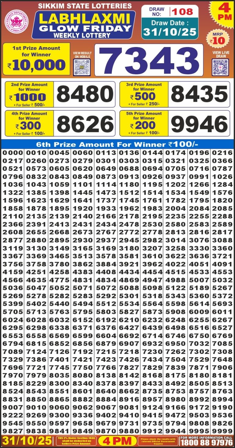 Labhlaxmi Glow Friday Weekly Lottery 4 PM Result 31-10-25 0 Likes 3 Views Share now: XFacebookPinterestRedditVKDiggLinkedinMix Related Articles 0 4 Labhlaxmi glow friday weekly lottery 4 pm result 30-5-25 0 4 Labh Laxmi Charm Tuesday Weekly Lottery 4 PM Result 04-11-25 0 5 Labhlaxmi glow friday weekly lottery 4 pm result 4-7-25 0 9 Labh Laxmi bliss monday weekly lottery 4 pm result 5-5-25