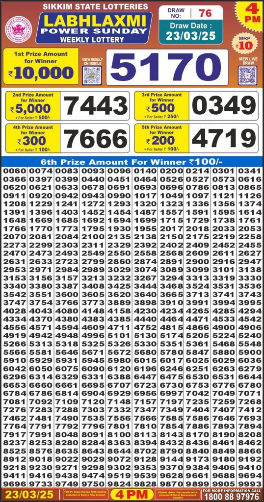 Labhlaxmi power sunday weekly lottery 4 pm result 23-3-25 Results Editorial Staff March 23, 2025 Leave a Comment on Labhlaxmi power sunday weekly lottery 4 pm result 23-3-25 Posted in Results Share: XFacebookPinterestRedditVKDiggLinkedinMix Related Results Punjab State Dear 200 Monthly Lottery 6pm Result 07-02-26 Punjab State Lohri Bumper Lottery Result 2026 Live Updates Dear X-Mas Bumper 6pm Lottery Result 27-12-25 Punjab State Dear 100 Monthly Lottery 7pm Result 09-12-25 Punjab State Lottery Dear 100 Monthly 7pm Result 11-11-2025 Dear 2000 Monthly Lottery 7pm Result 08-11-25 Check Now Dear Puja Bumper Lottery Result 11-10-25 Publish Author: Results Editorial Staff