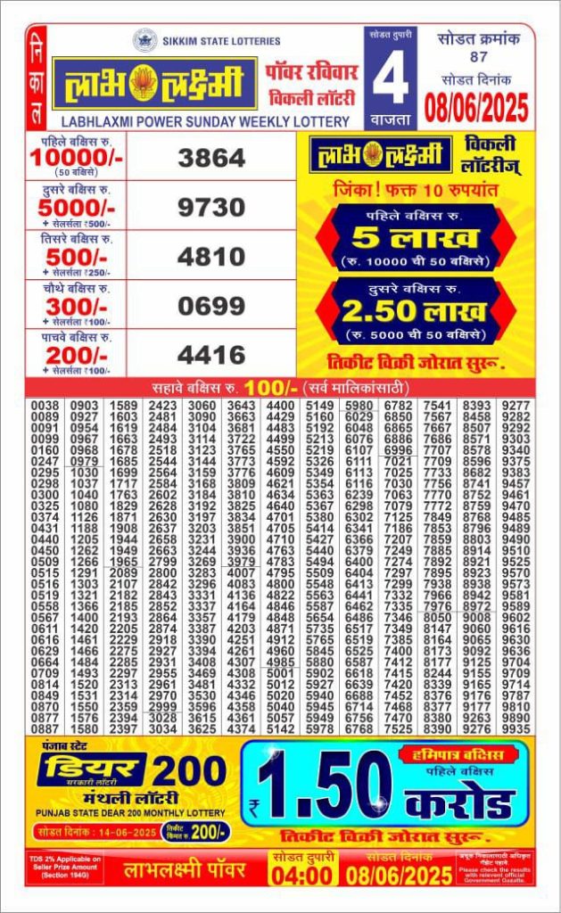 Labhlaxmi power sunday weekly lottery 4 pm result 8-6-25 Results Editorial Staff June 8, 2025 Leave a Comment on Labhlaxmi power sunday weekly lottery 4 pm result 8-6-25 Posted in Labh Laxmi Lottery 4PM Result Share: XFacebookPinterestRedditVKDiggLinkedinMix Labh Laxmi Bliss Monday 4PM Lottery Result Update 📅 Date: 08 June 2025 ⏰ Draw Time: 4:00 PM 🟢 Result Declared 🔗 View previous Labh Laxmi Lottery 4PM Result results Related Results Labh Laxmi Bliss Monday Weekly Lottery 4pm Result 02-03-26 Labh Laxmi Power Sunday Weekly Lottery 4pm Result 01-03-26 Labh Laxmi Joy Saturday Weekly Lottery 4pm Result 28-02-26 Labh Laxmi Glow Friday Weekly Lottery 4pm Result 27-02-26 Labh Laxmi Glad Thursday Weekly Lottery 4pm Result 26-02-26 Labh Laxmi Delight Wednesday Weekly Lottery 4pm Result 25-02-26 Labh Laxmi Charm Tuesday Weekly Lottery 4pm Result 24-02-26 Author: Results Editorial Staff