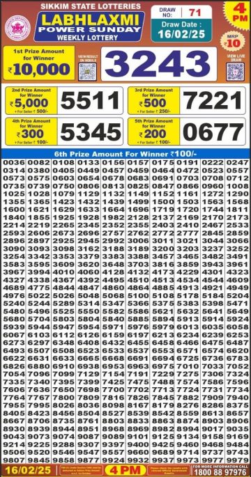 Labhlaxmi power sunday weekly lottery 4 pm result 16-2-25